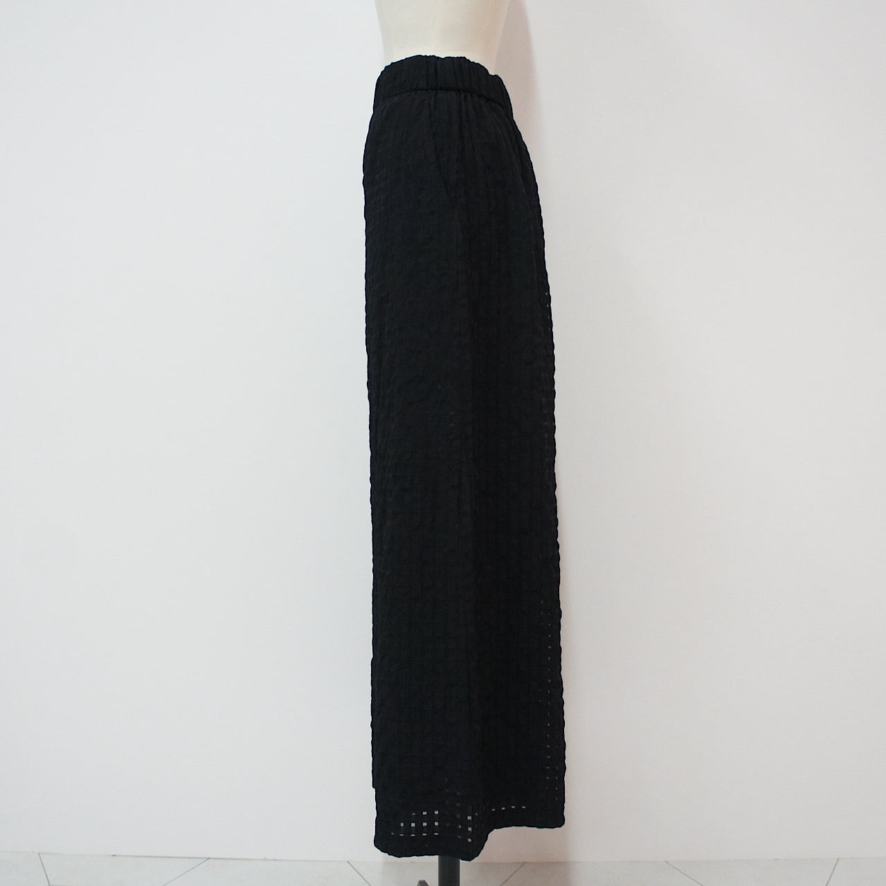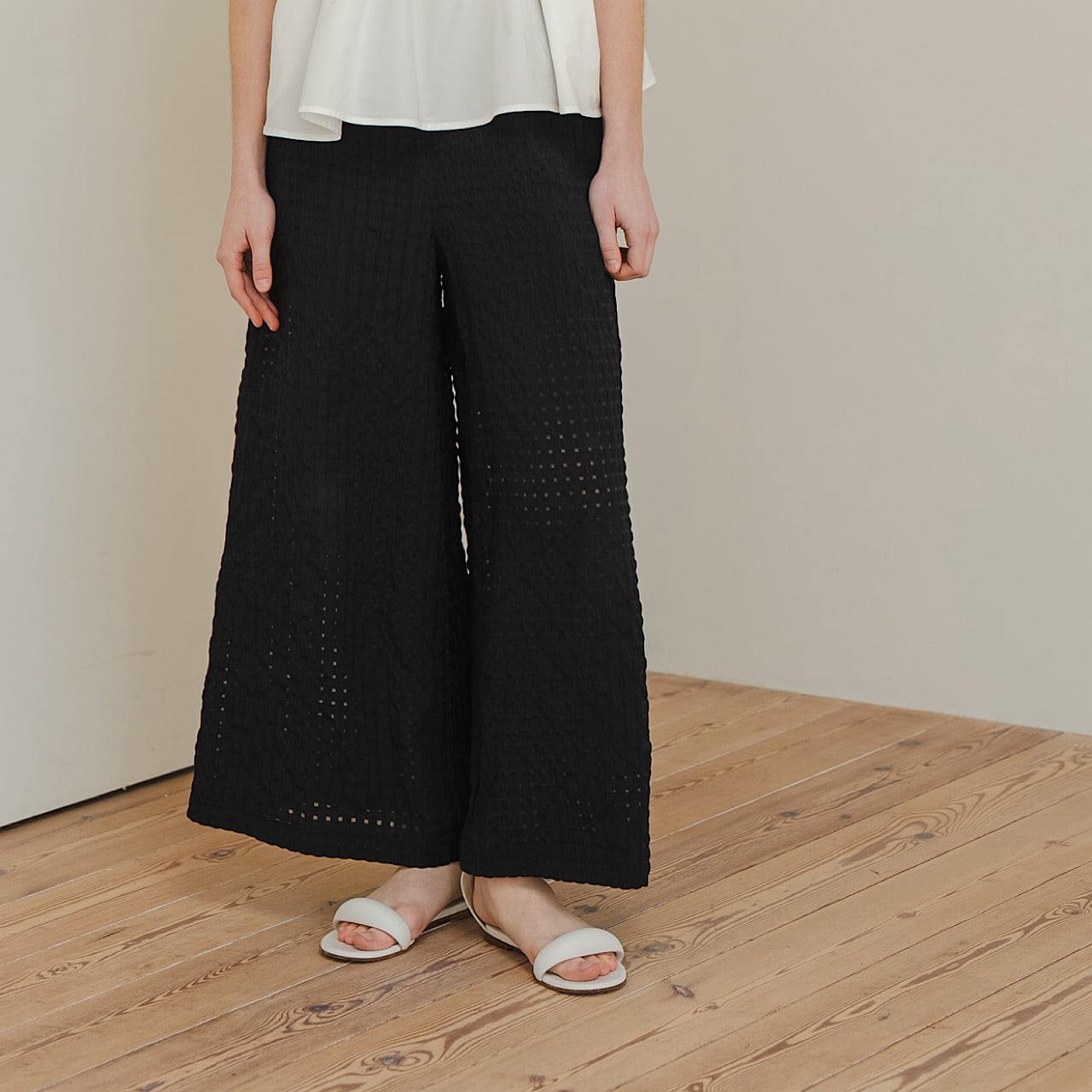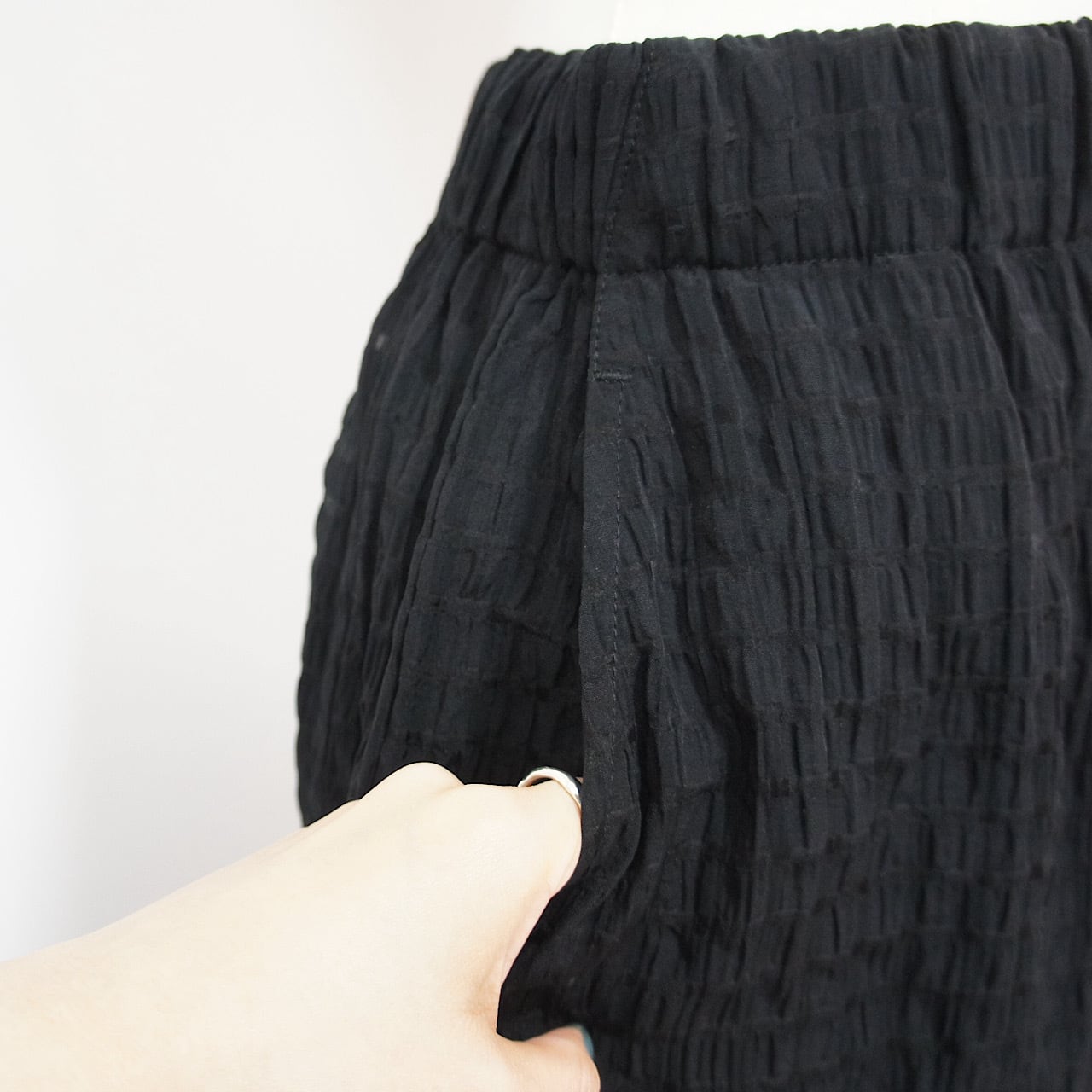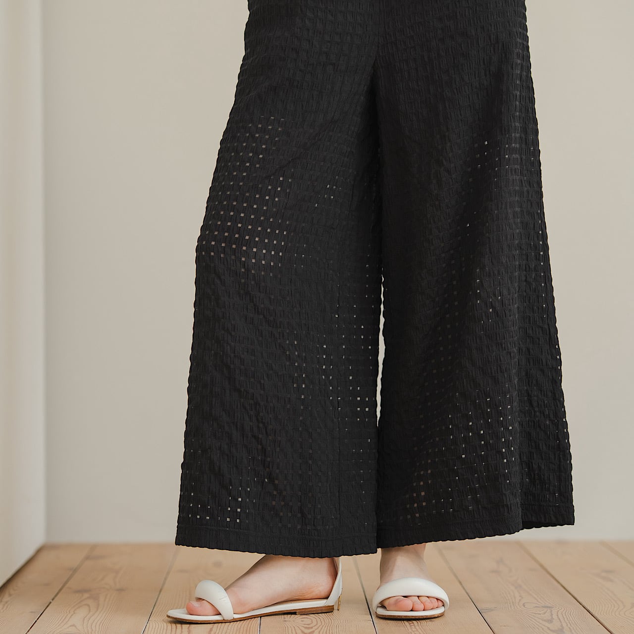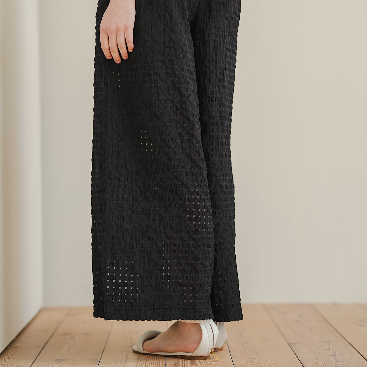 皺加工を施した生地が醸し出す軽やかな透け感と凹凸のある表情が、シンプルなコーディネートをぐっと洗練された印象に。