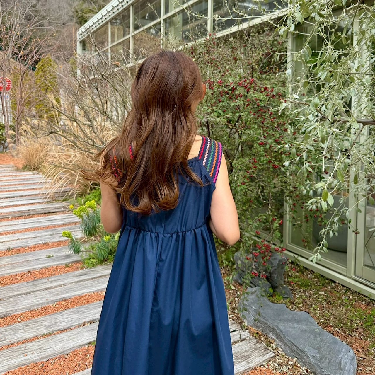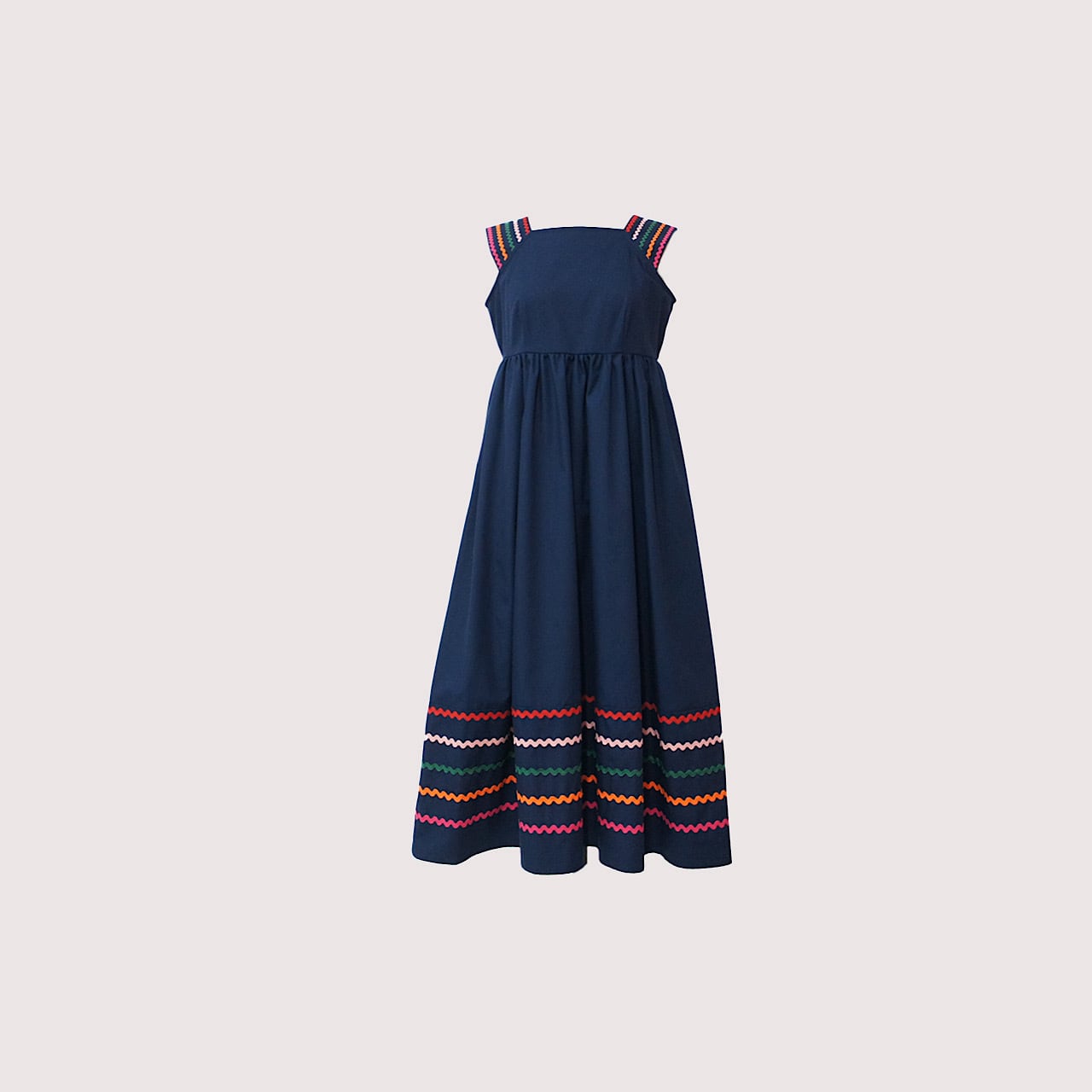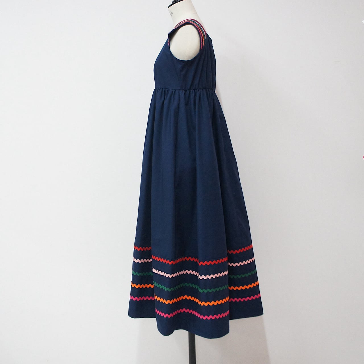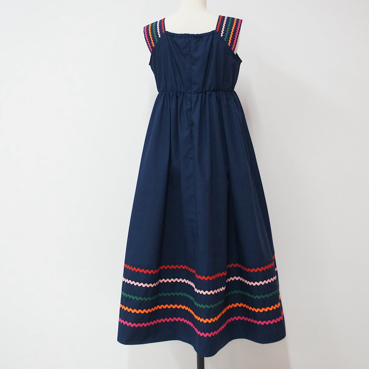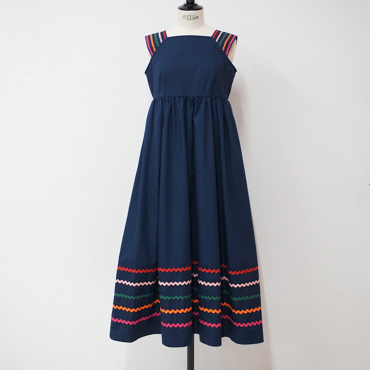 肩部分と裾に施したカラフルな刺繍がアクセントとなり、