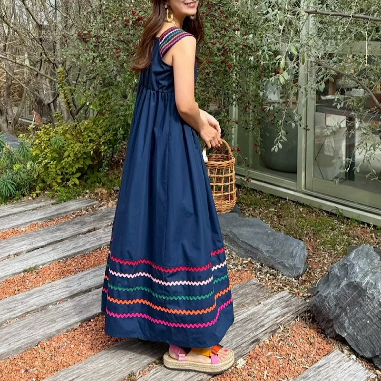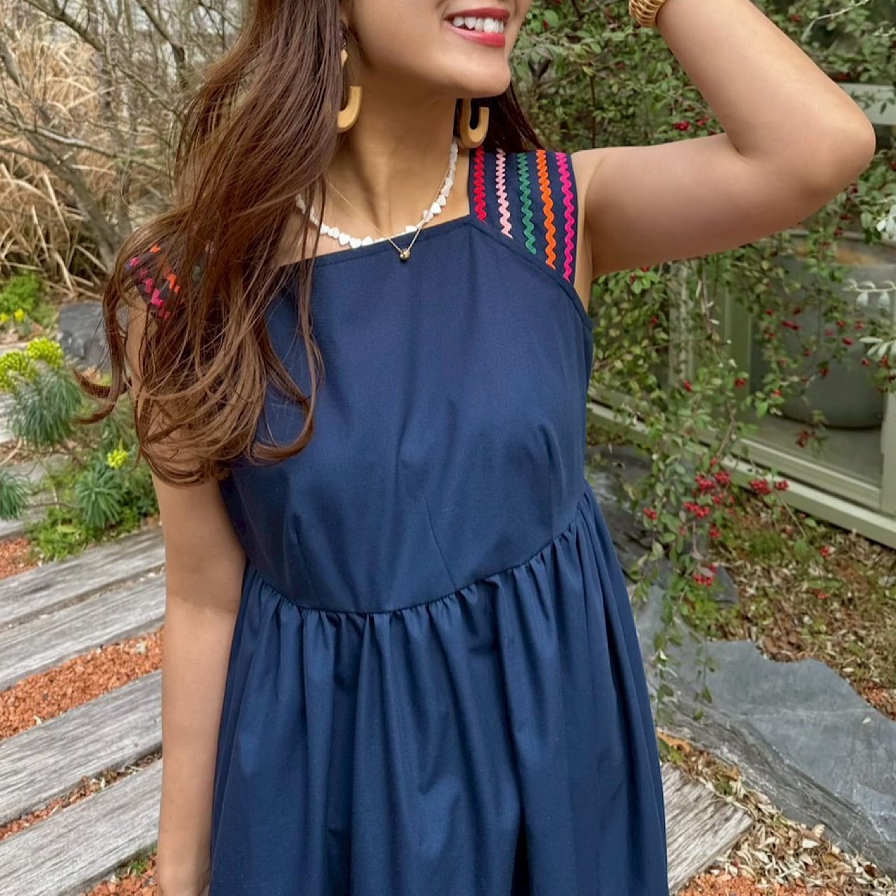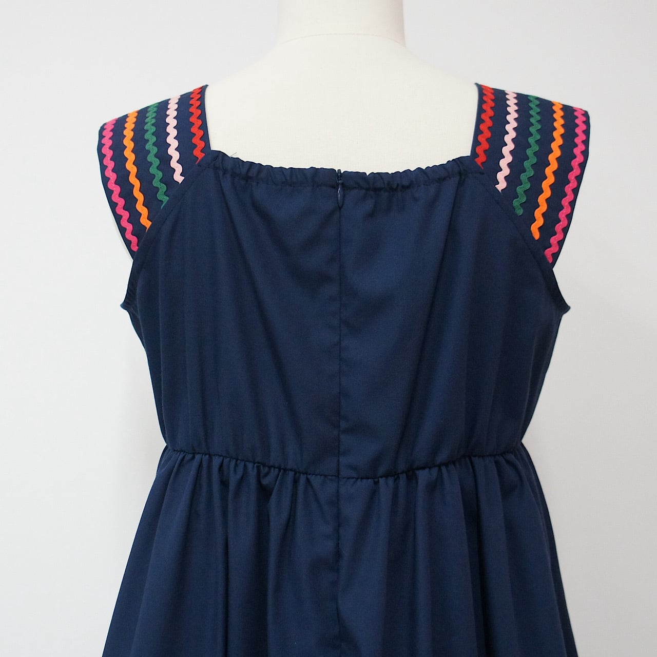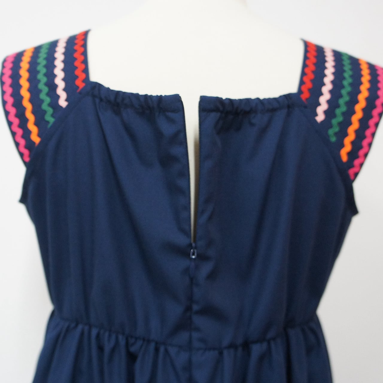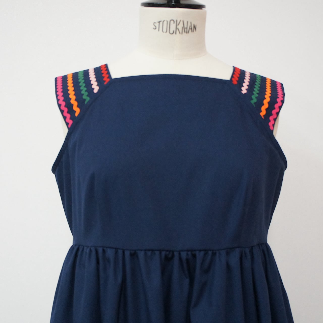 肩部分と裾に施したカラフルな刺繍がアクセントとなり、