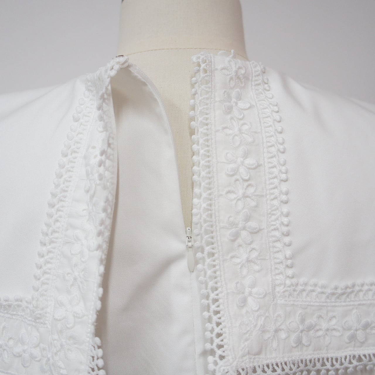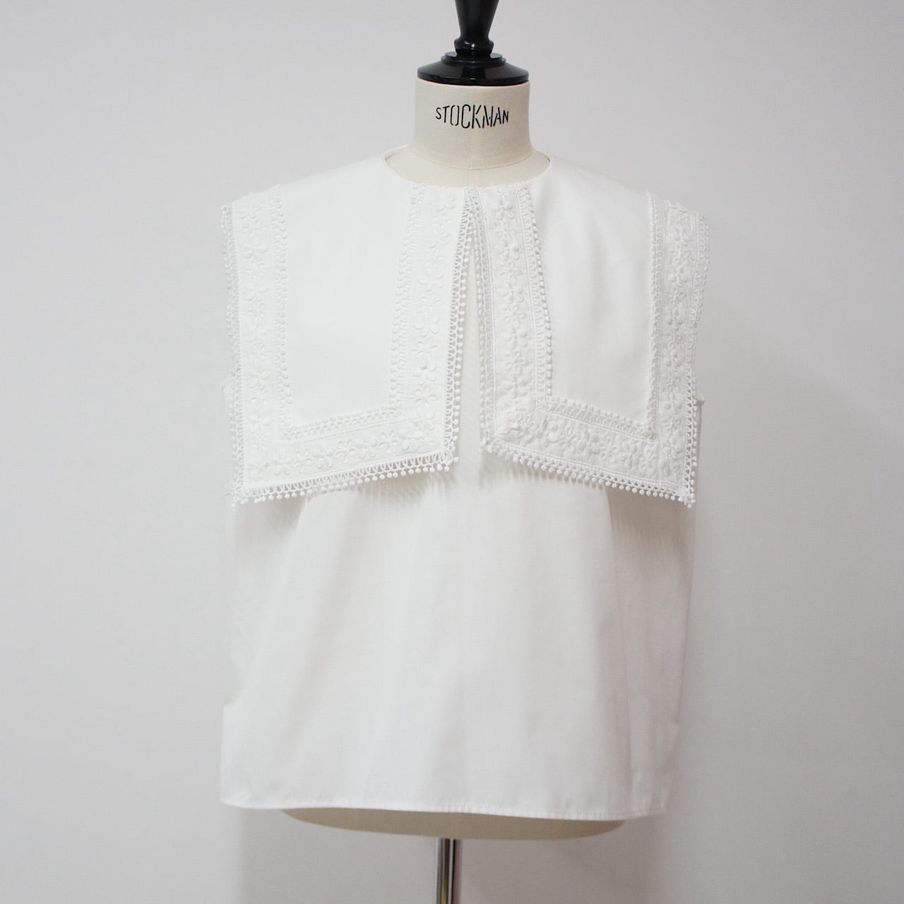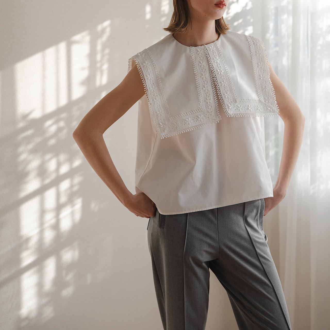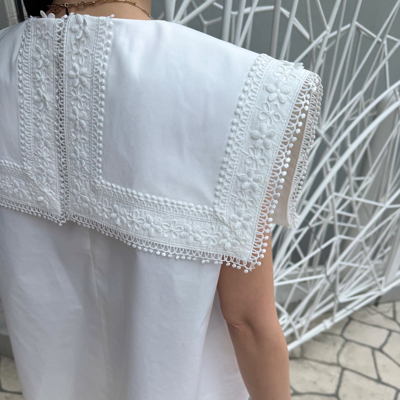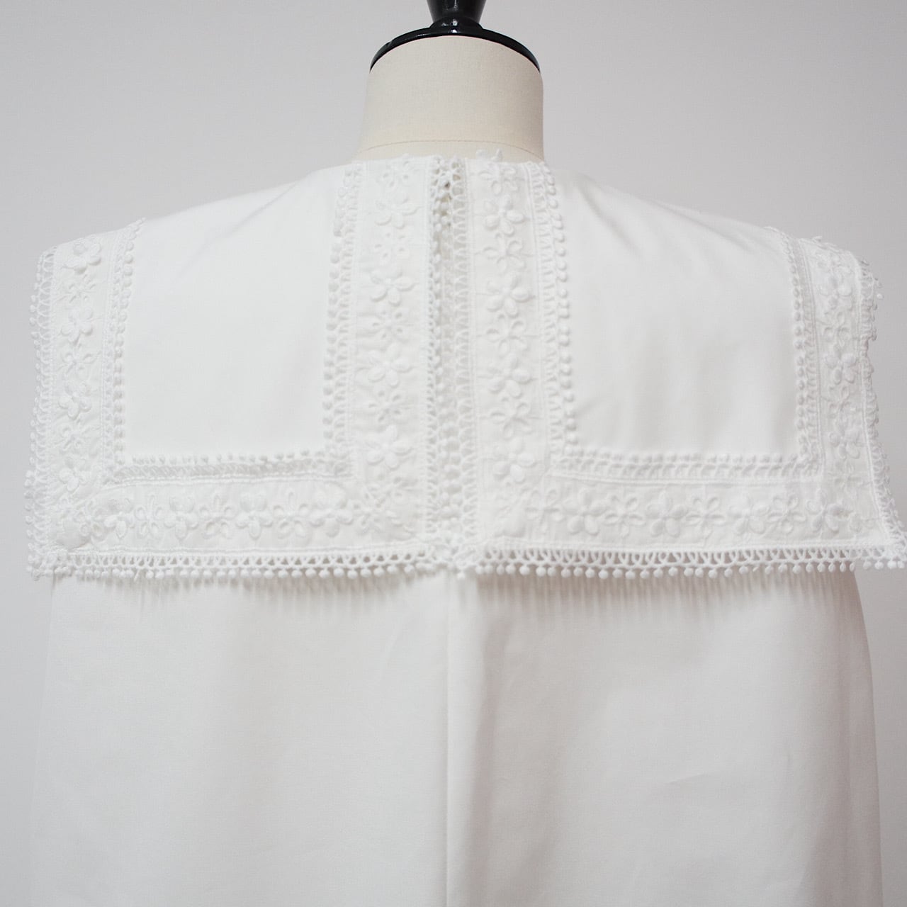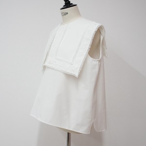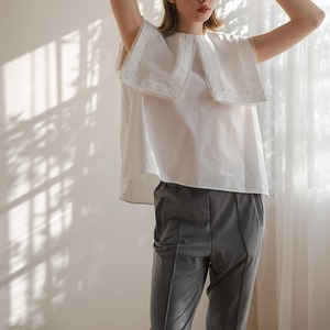 存在感のあるスクエアカラーに繊細なフラワーレースをたっぷりとあしらった一枚。