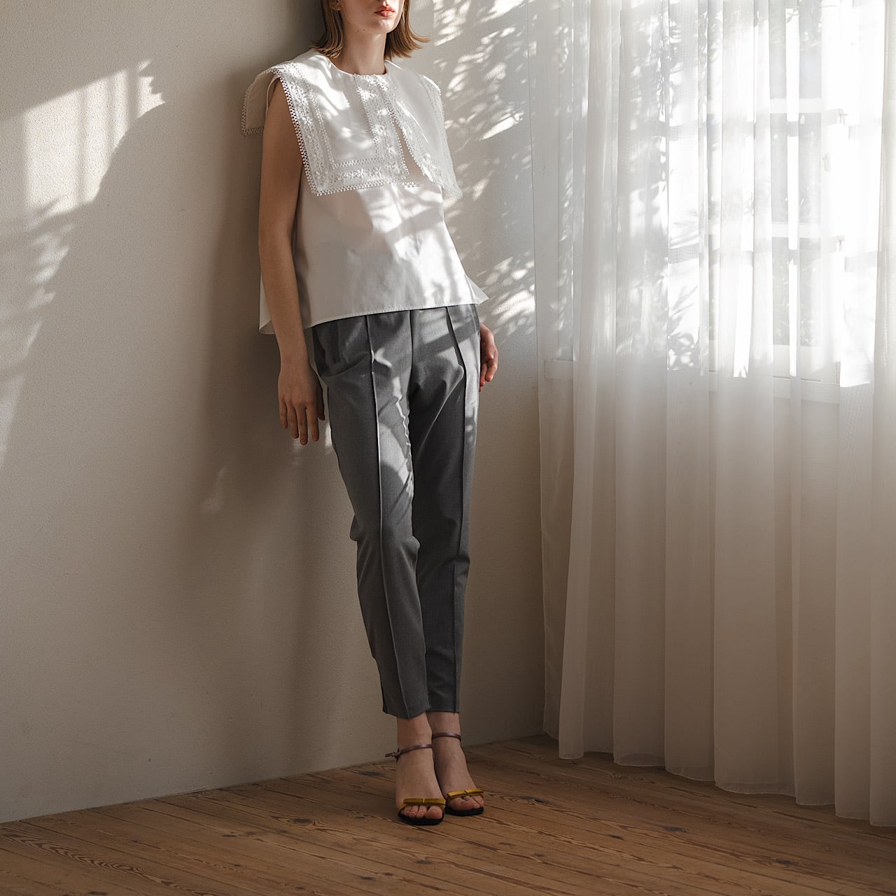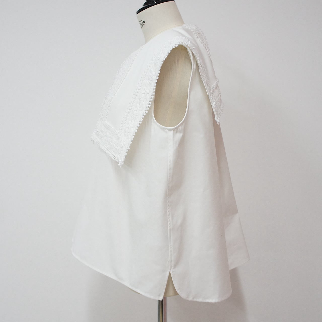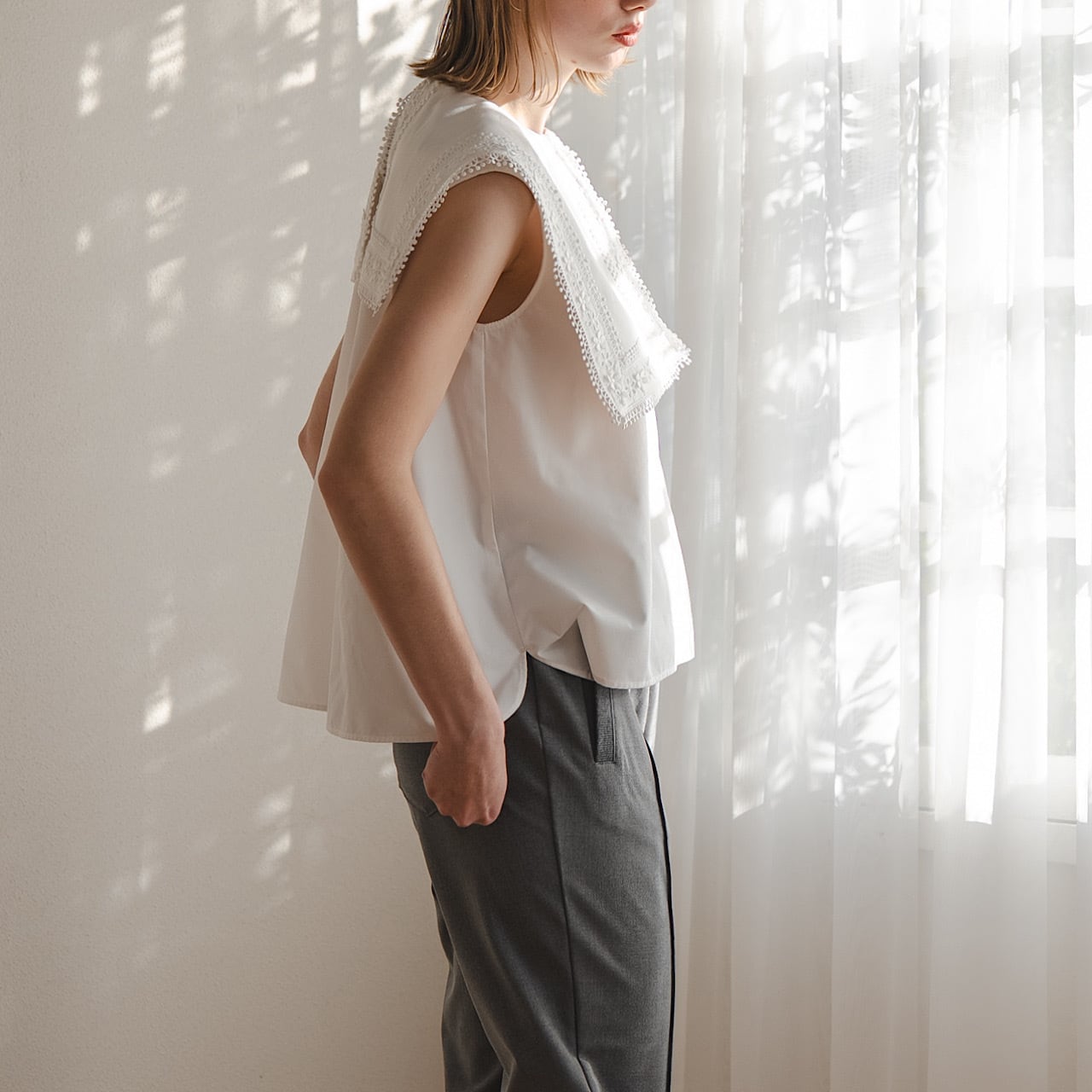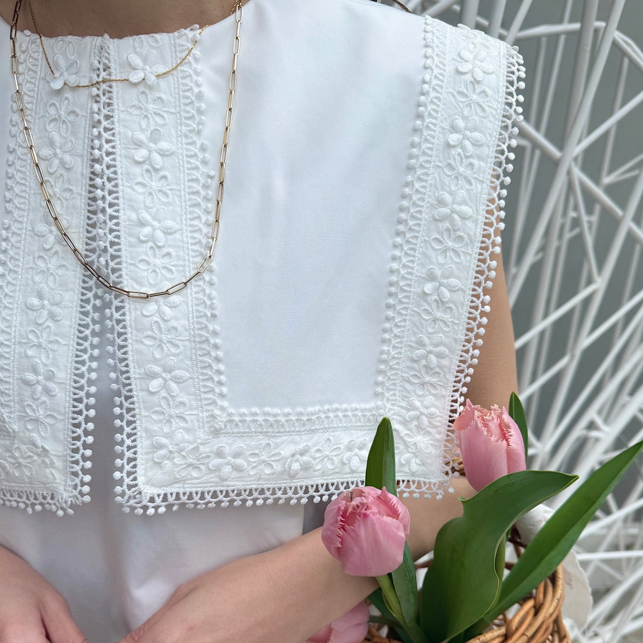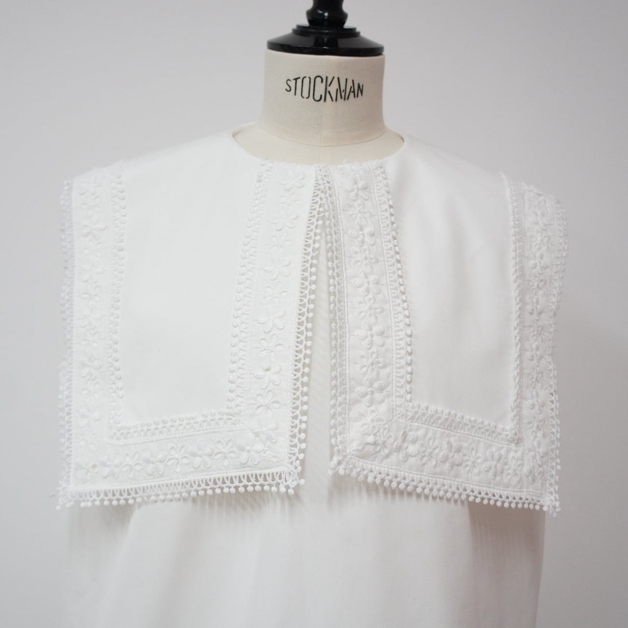 存在感のあるスクエアカラーに繊細なフラワーレースをたっぷりとあしらった一枚。