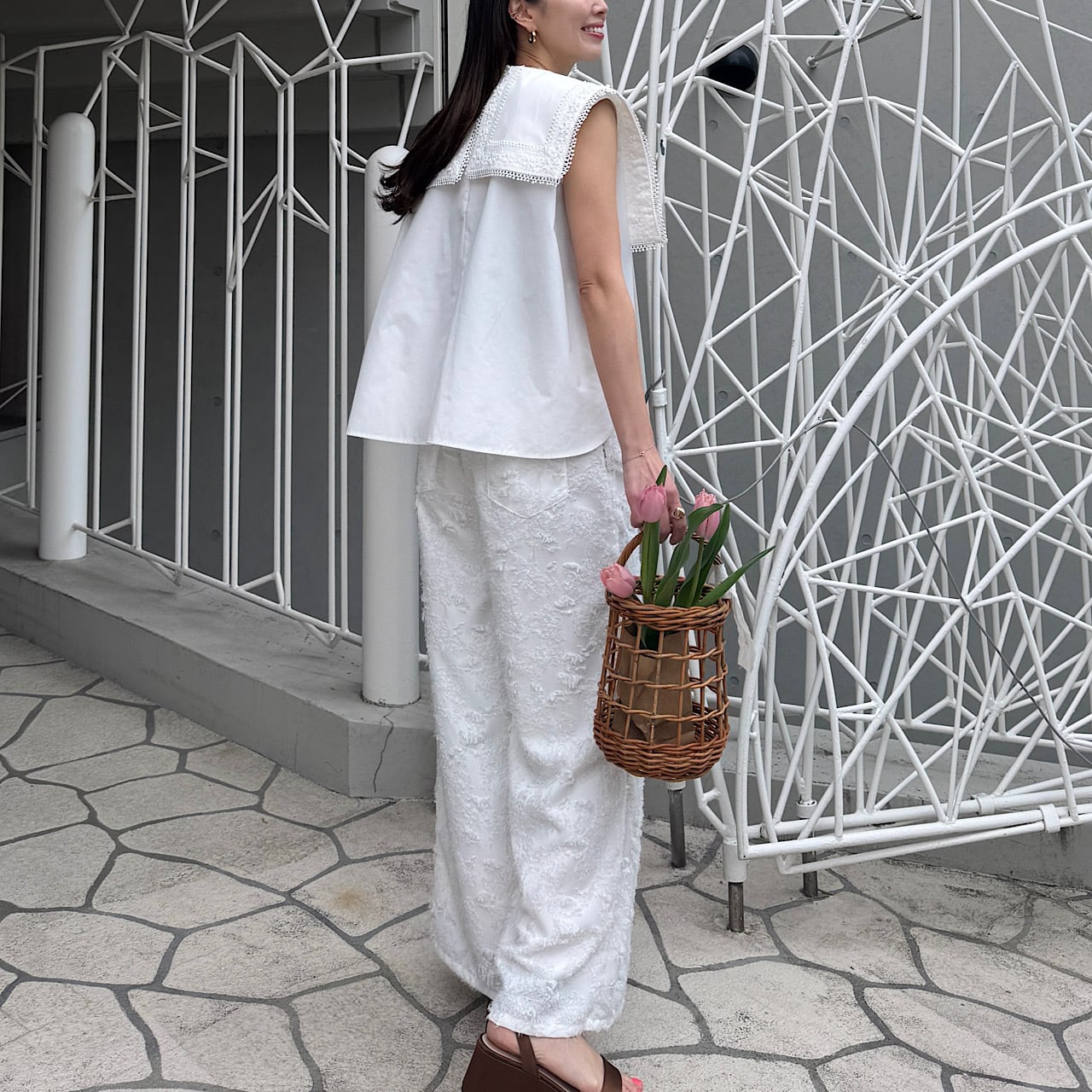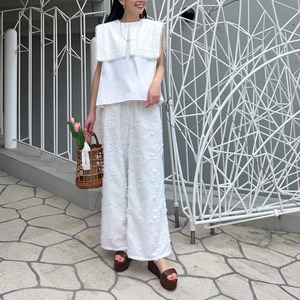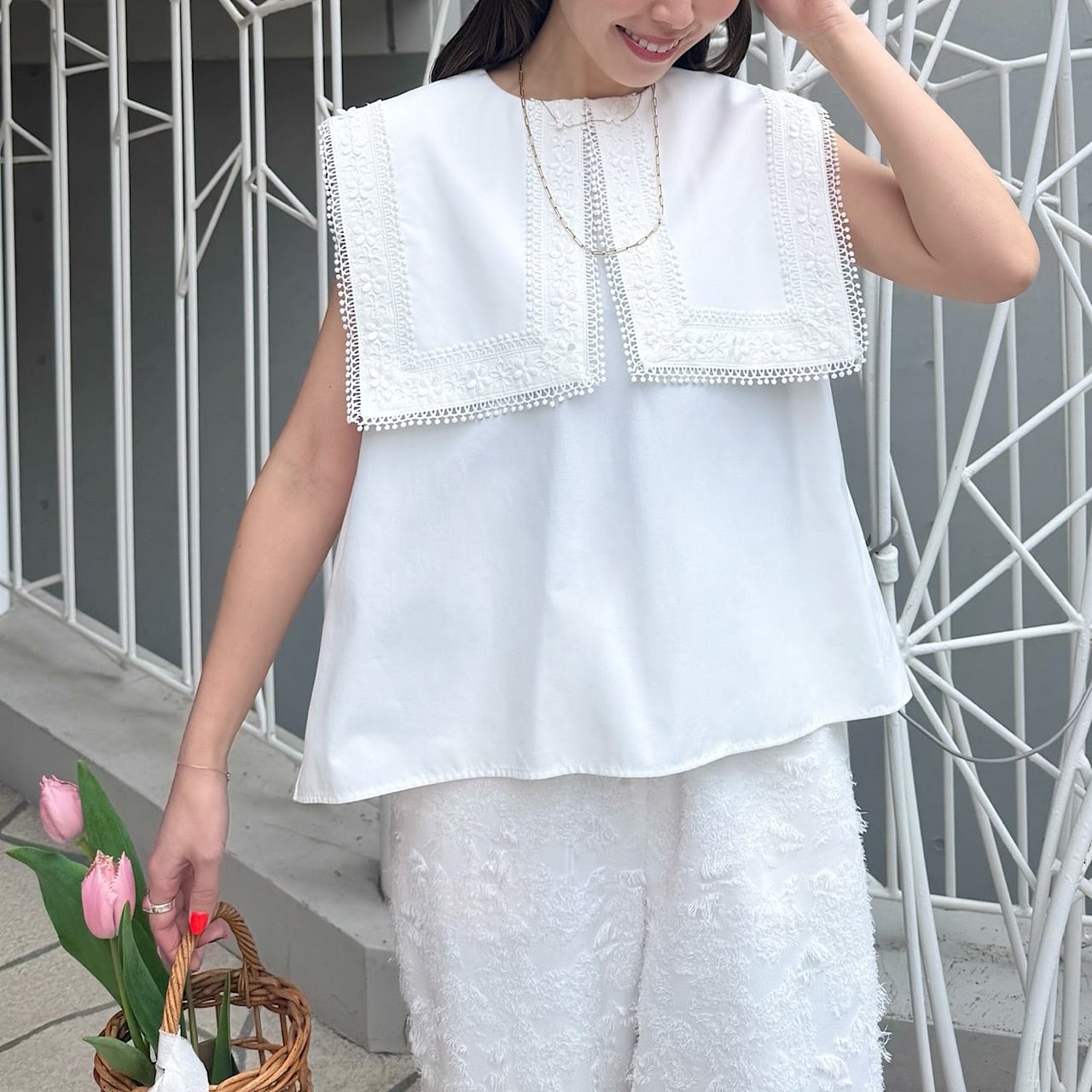 顔まわりをぐっと華やかに見せてくれるデザインで、程よくゆとりのあるシルエットは、体のラインを拾いすぎず、自然にスタイルアップ。