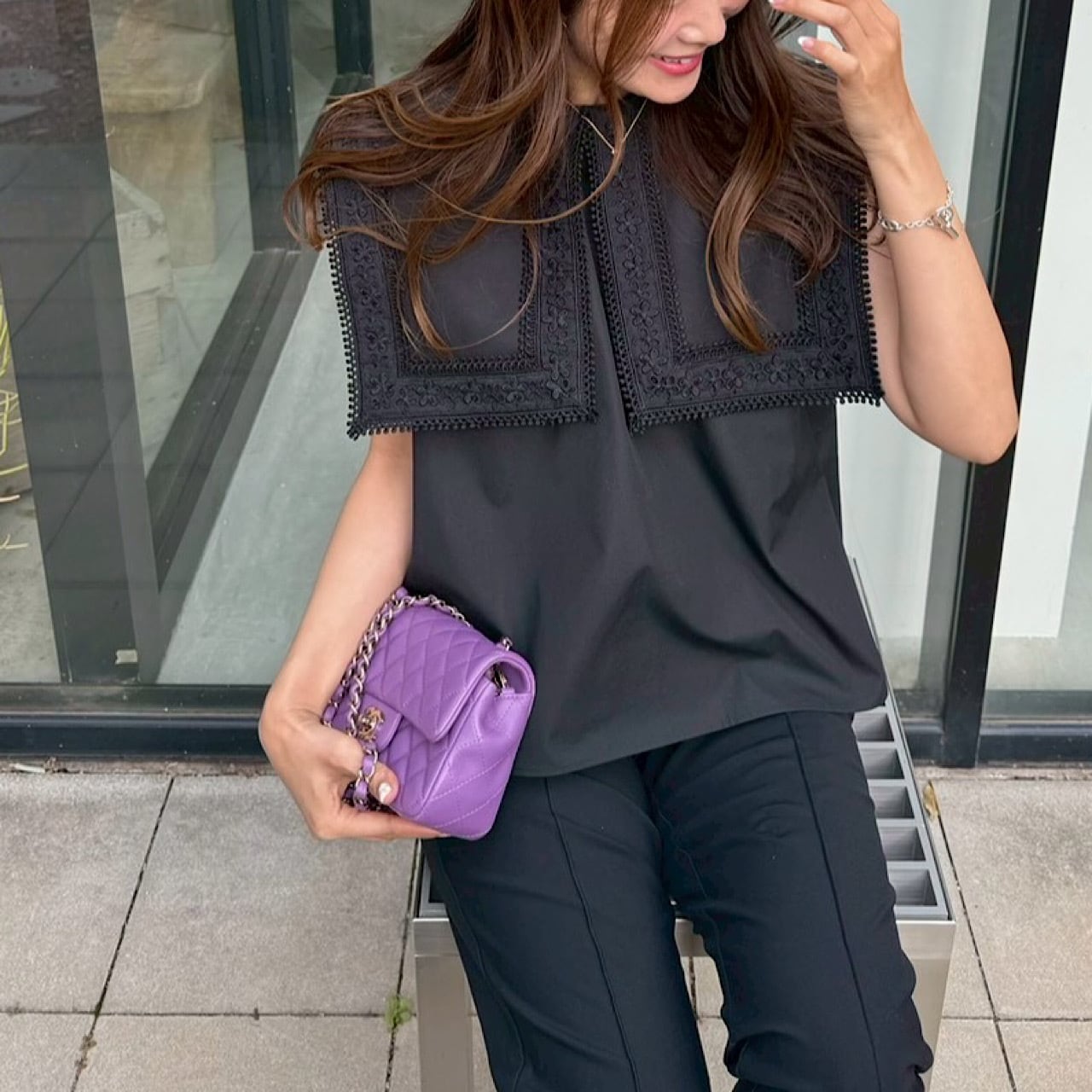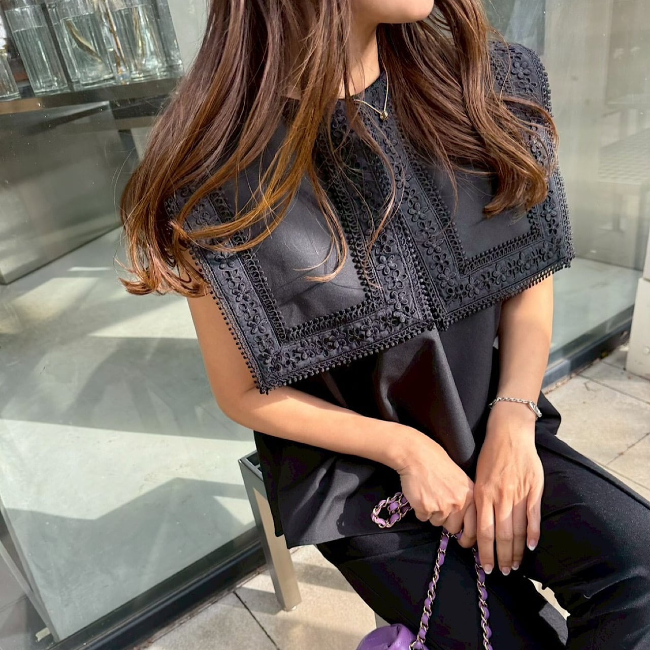 顔まわりをぐっと華やかに見せてくれるデザインで、程よくゆとりのあるシルエットは、体のラインを拾いすぎず、自然にスタイルアップ。