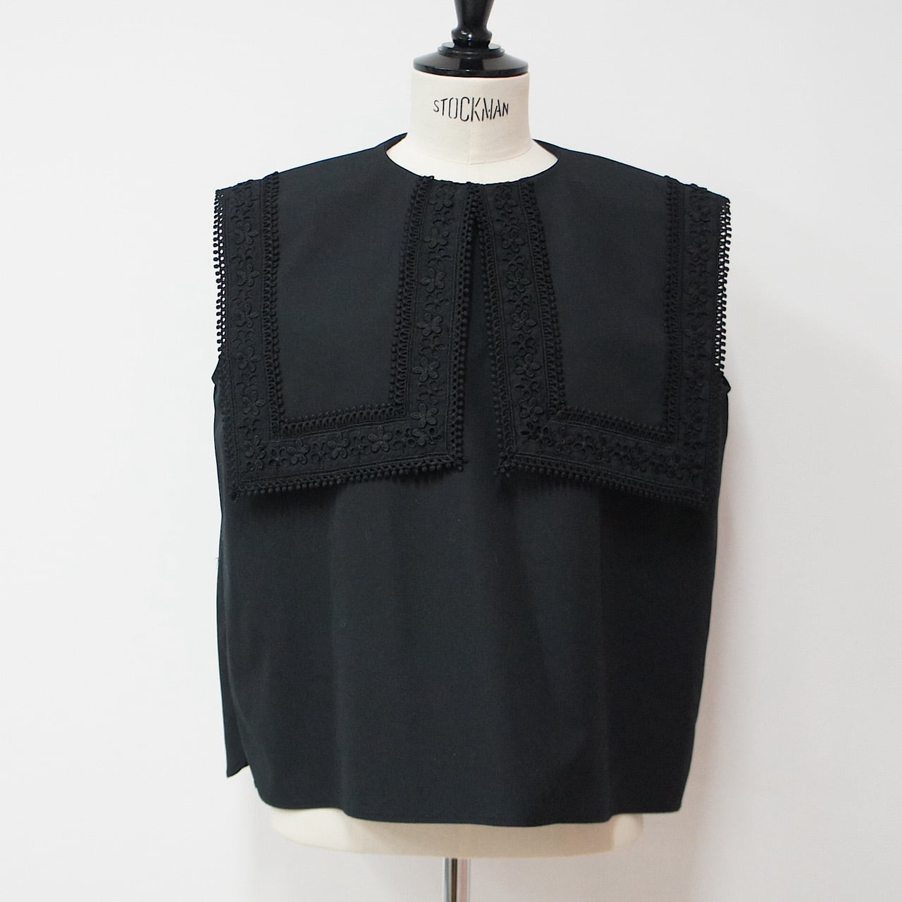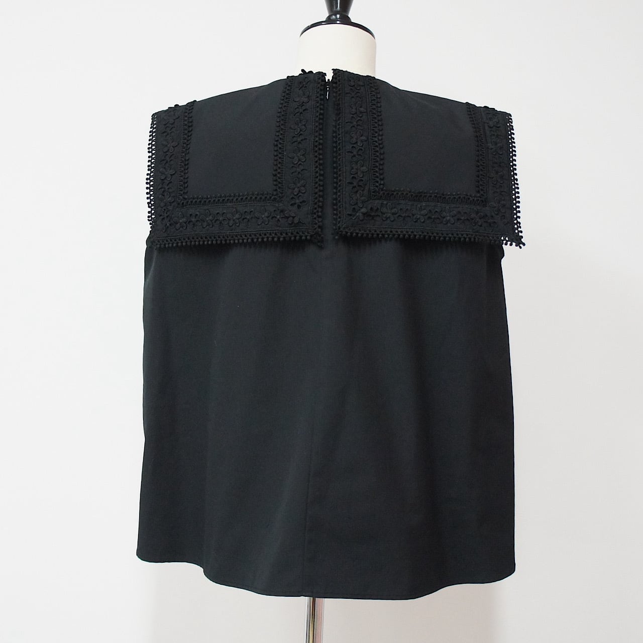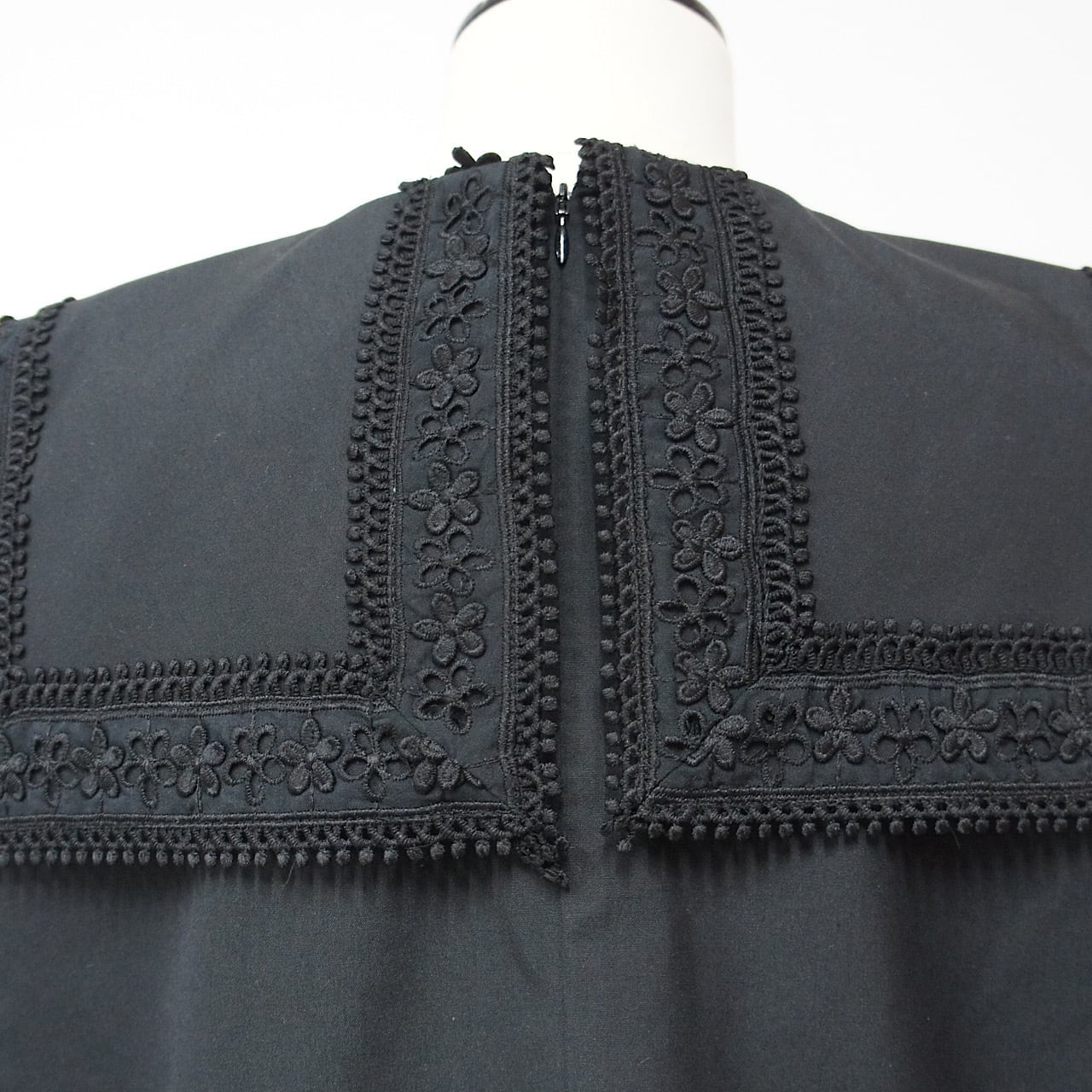 存在感のあるスクエアカラーに繊細なフラワーレースをたっぷりとあしらった一枚。