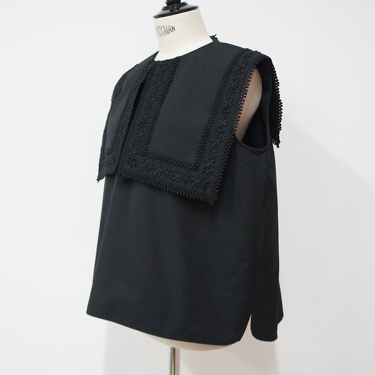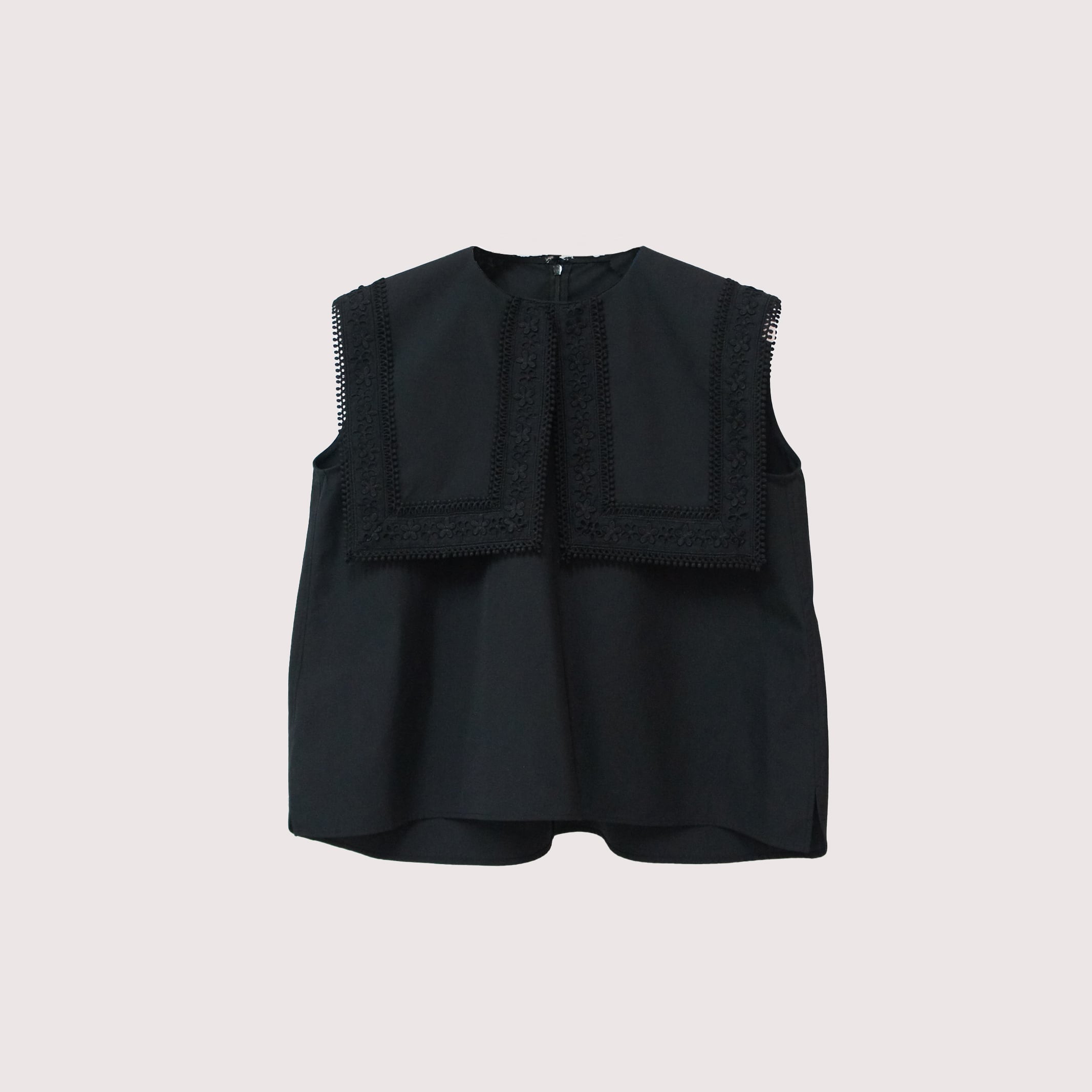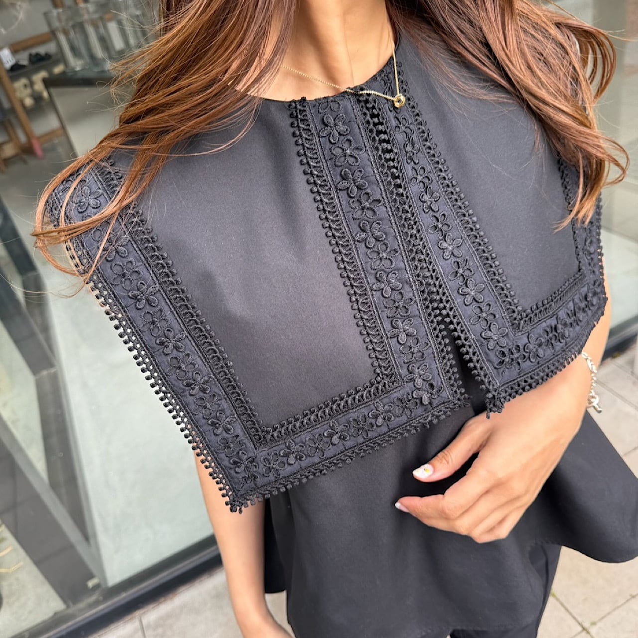 存在感のあるスクエアカラーに繊細なフラワーレースをたっぷりとあしらった一枚。