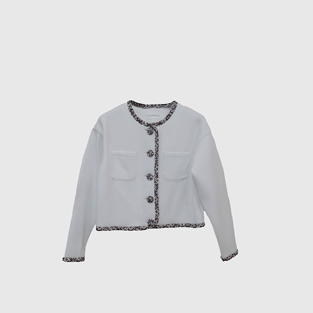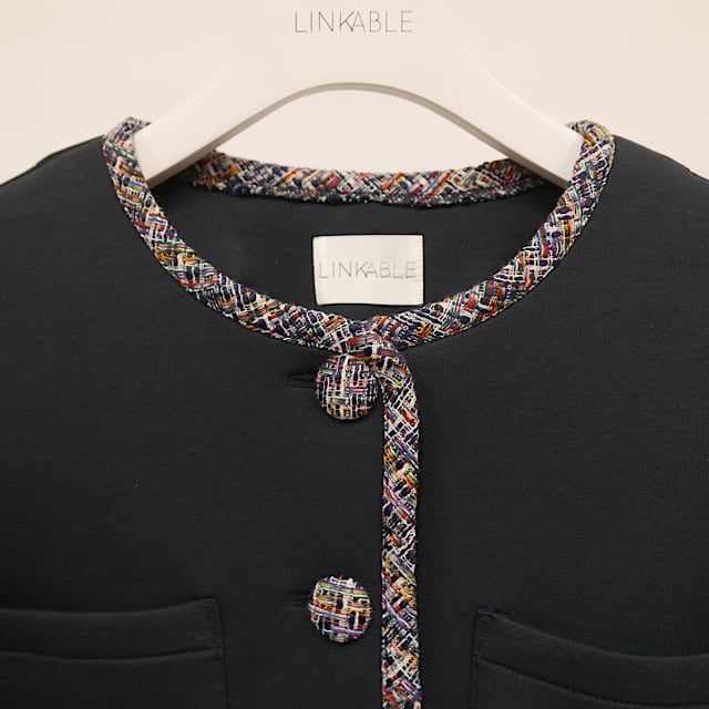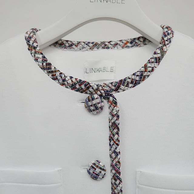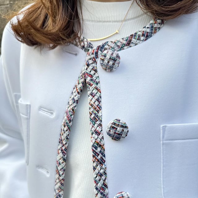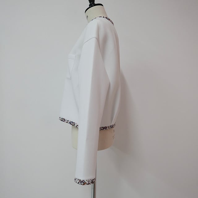 ツイードパイピングが目を惹くボンディング素材のジャケット。