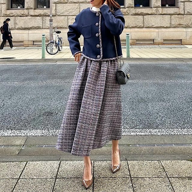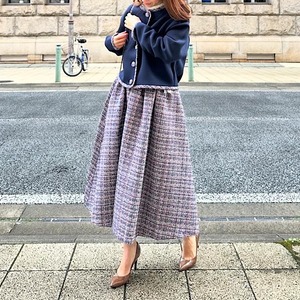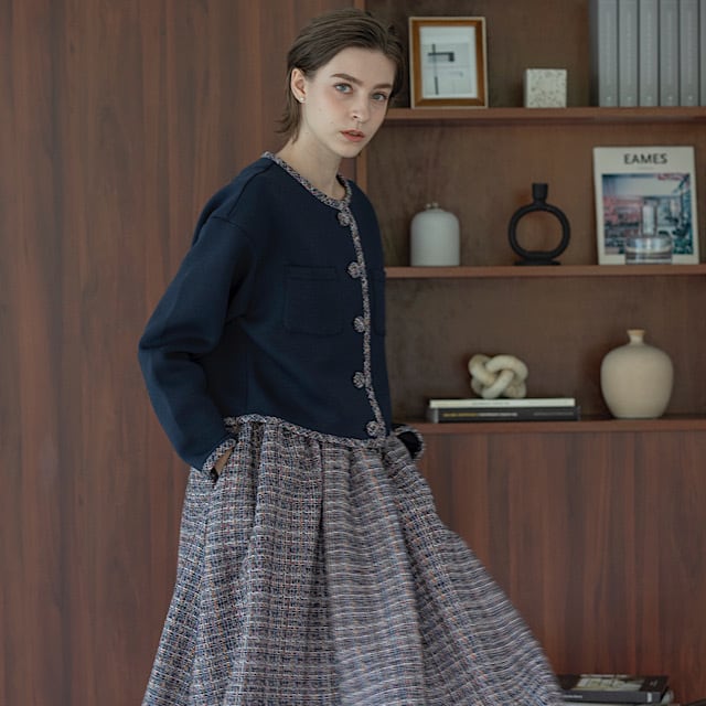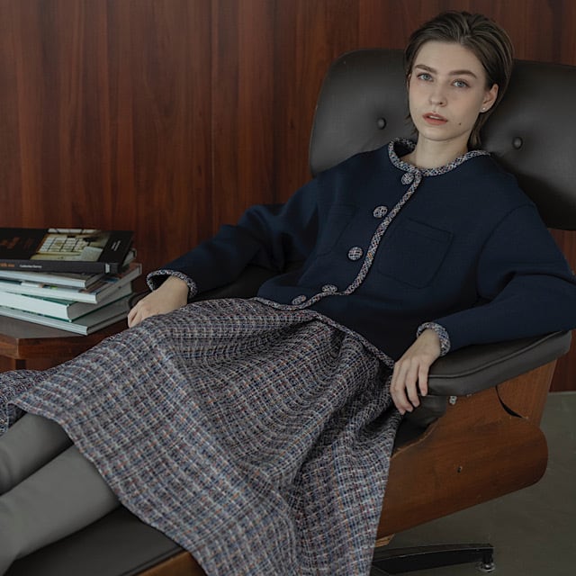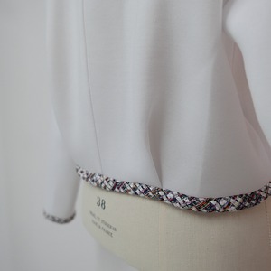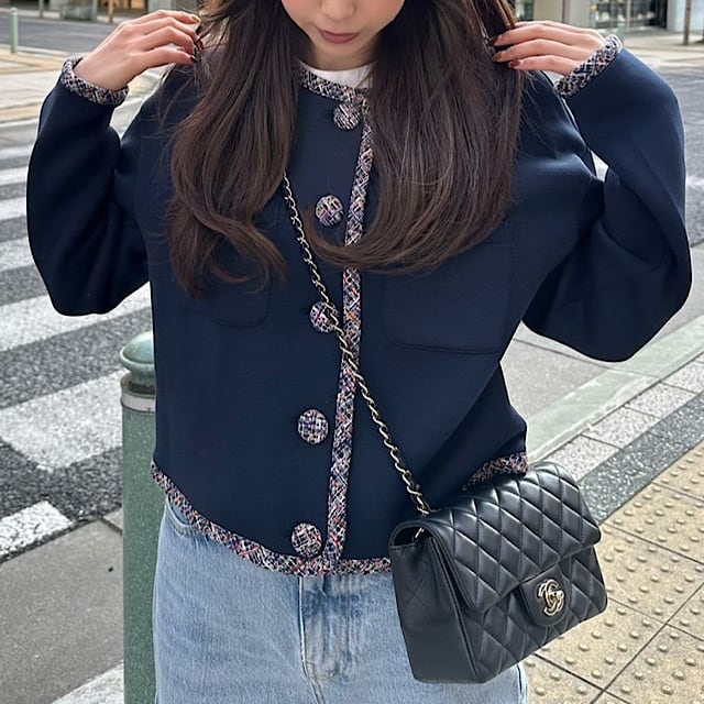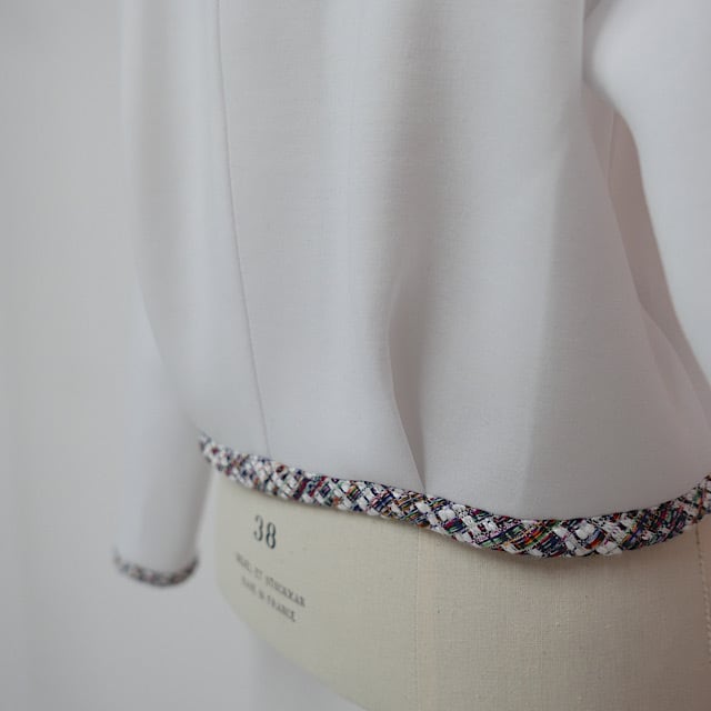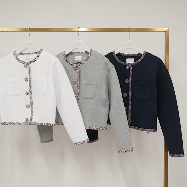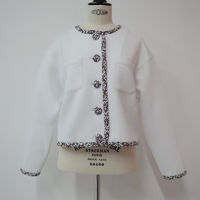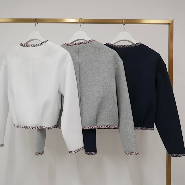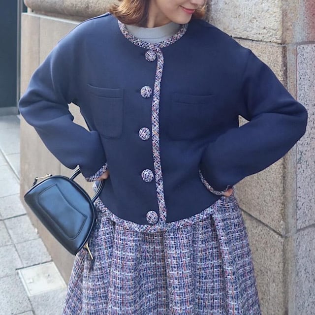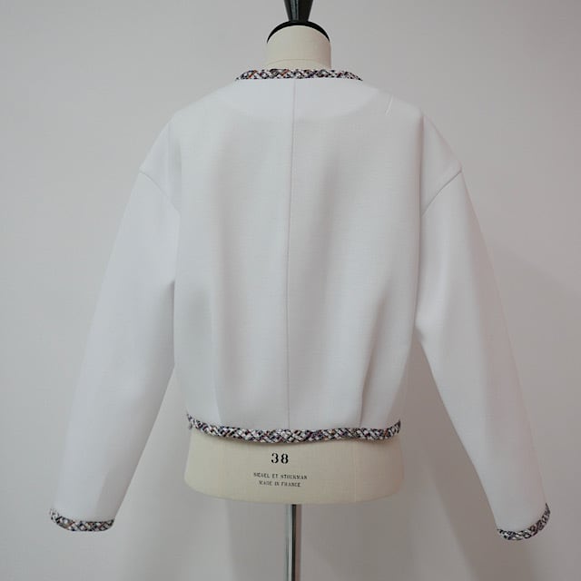 ツイードパイピングが目を惹くボンディング素材のジャケット。