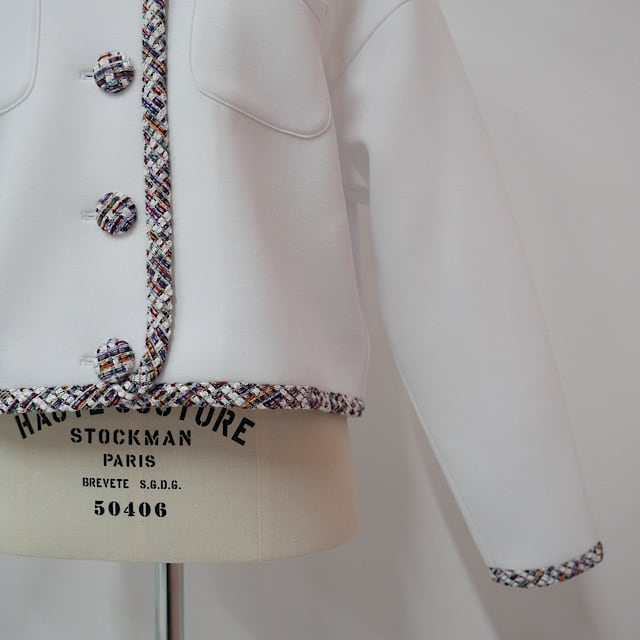 ツイードパイピングが目を惹くボンディング素材のジャケット。