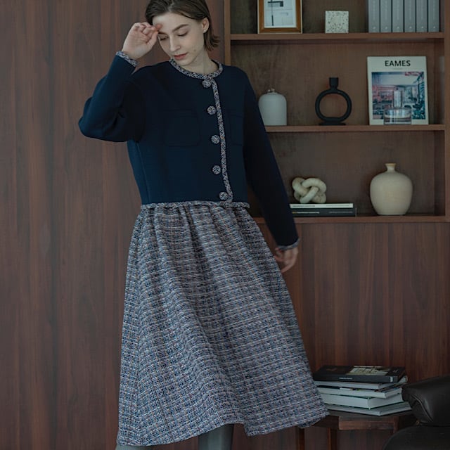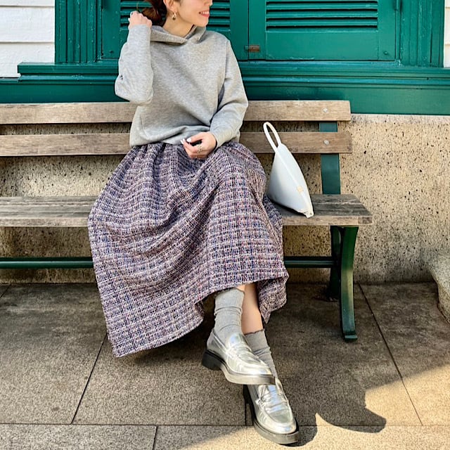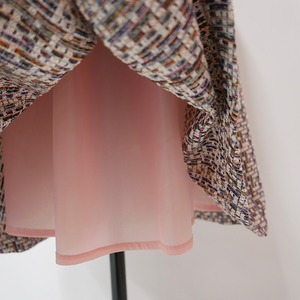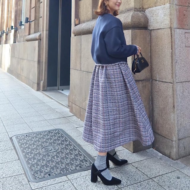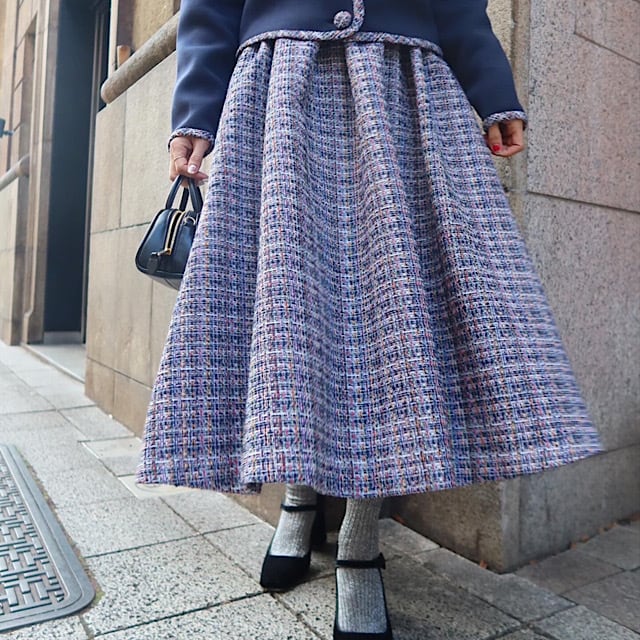 同じツイードを使用したツイードパイピングジャケットとセットアップでオケージョン使いもおすすめ。
