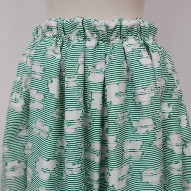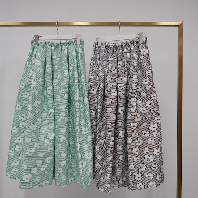 細かいボーダーにフラワーモチーフが目をひくスカート。