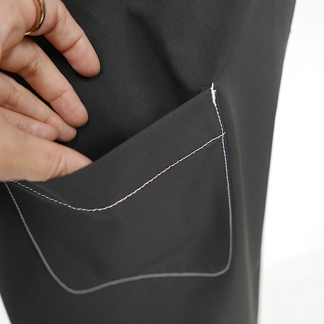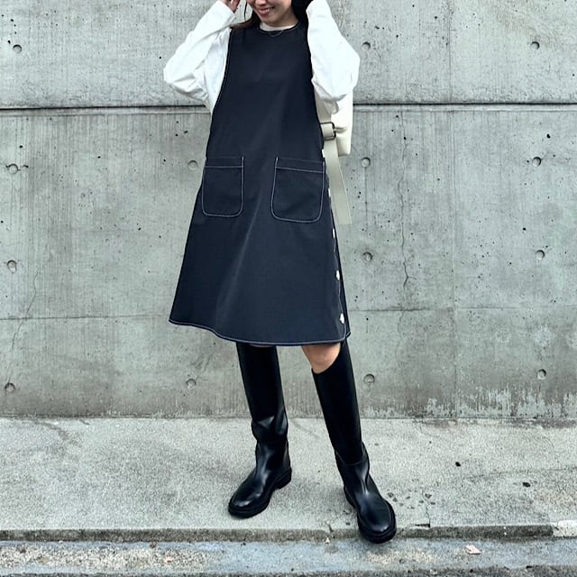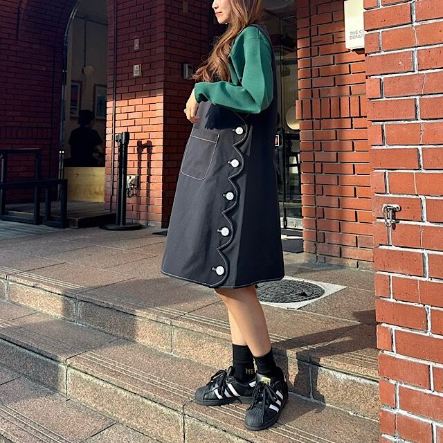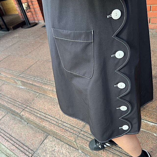配色ステッチと大きめのボタンがスカラップをより印象的に見せてくれます。