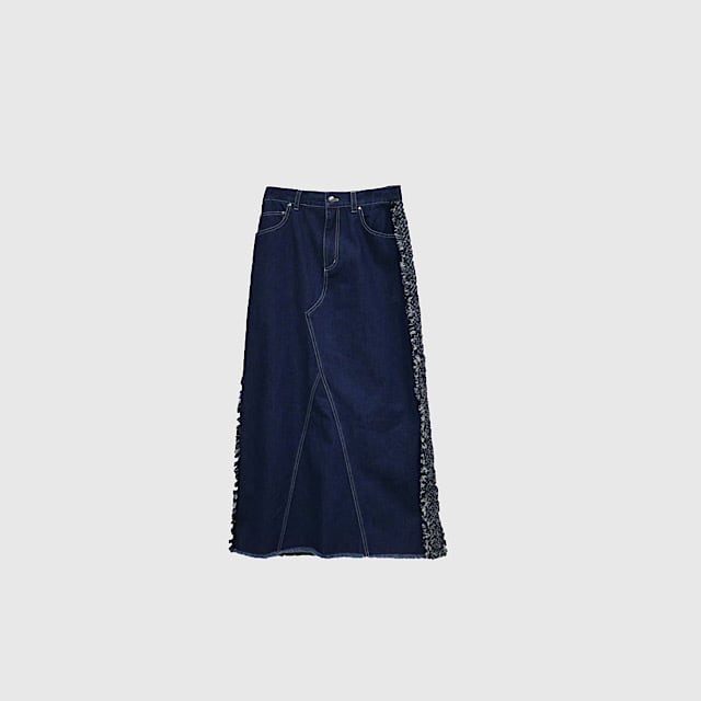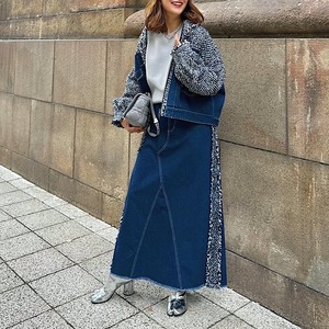 ツイード素材とデニムのドッキングが新鮮なロングスカート。