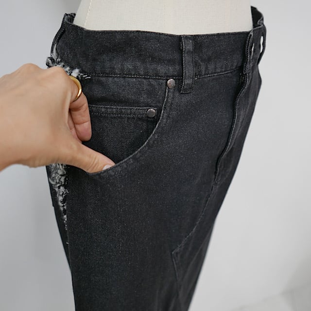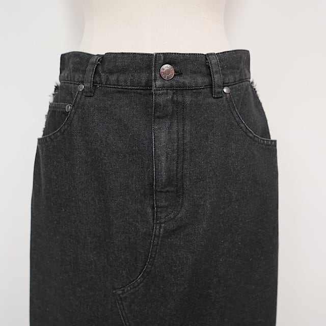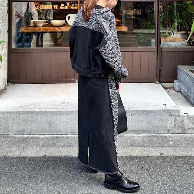 ツイード素材とデニムのドッキングが新鮮なロングスカート。