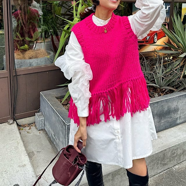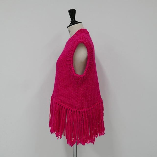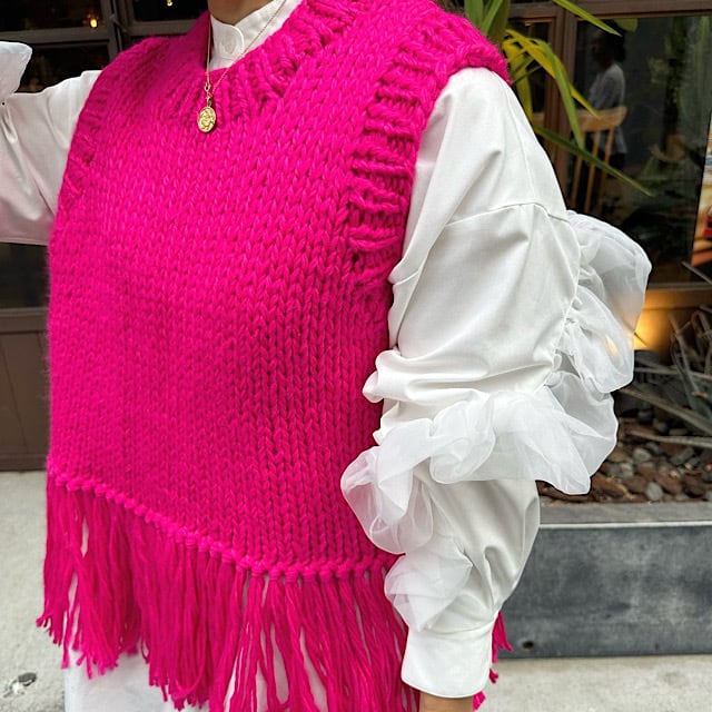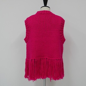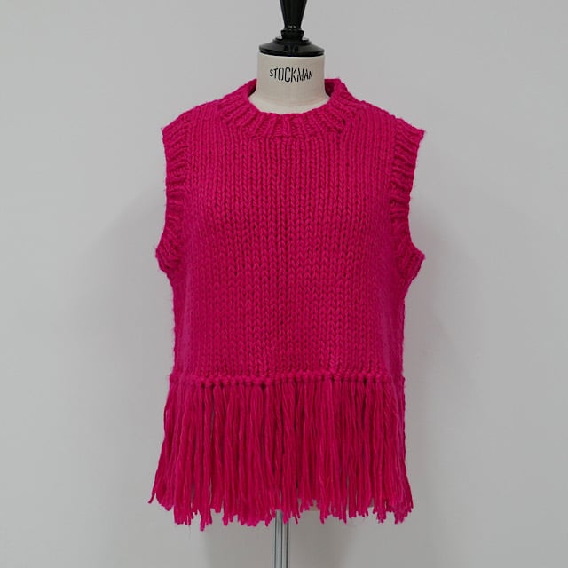 ウエスト部分から切り替わり贅沢にフリンジがついたニットベスト。シャツやカットソーに合わせてコーディネートを華やかに。