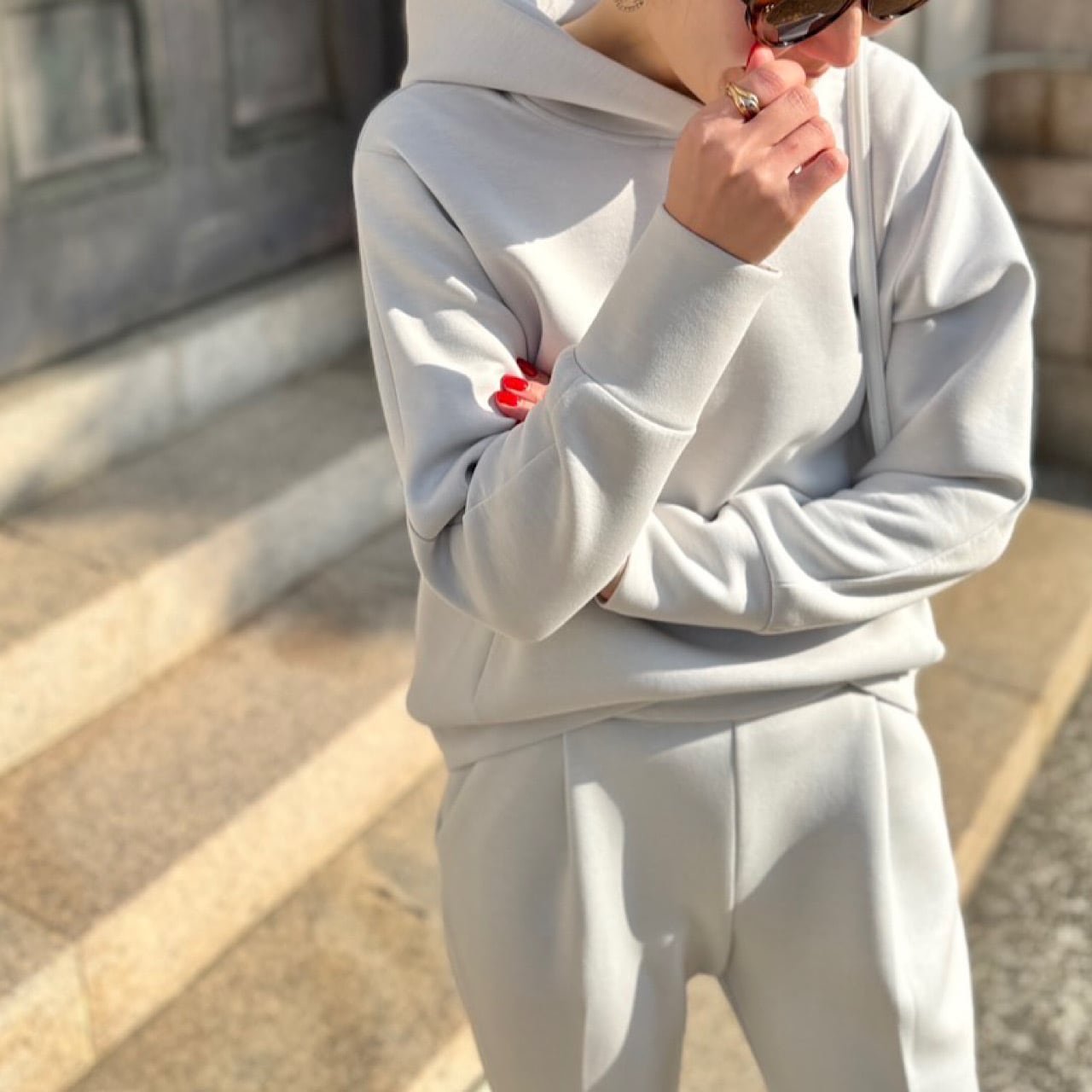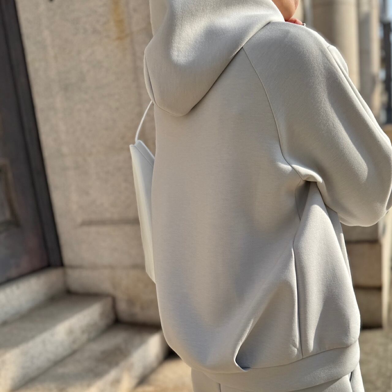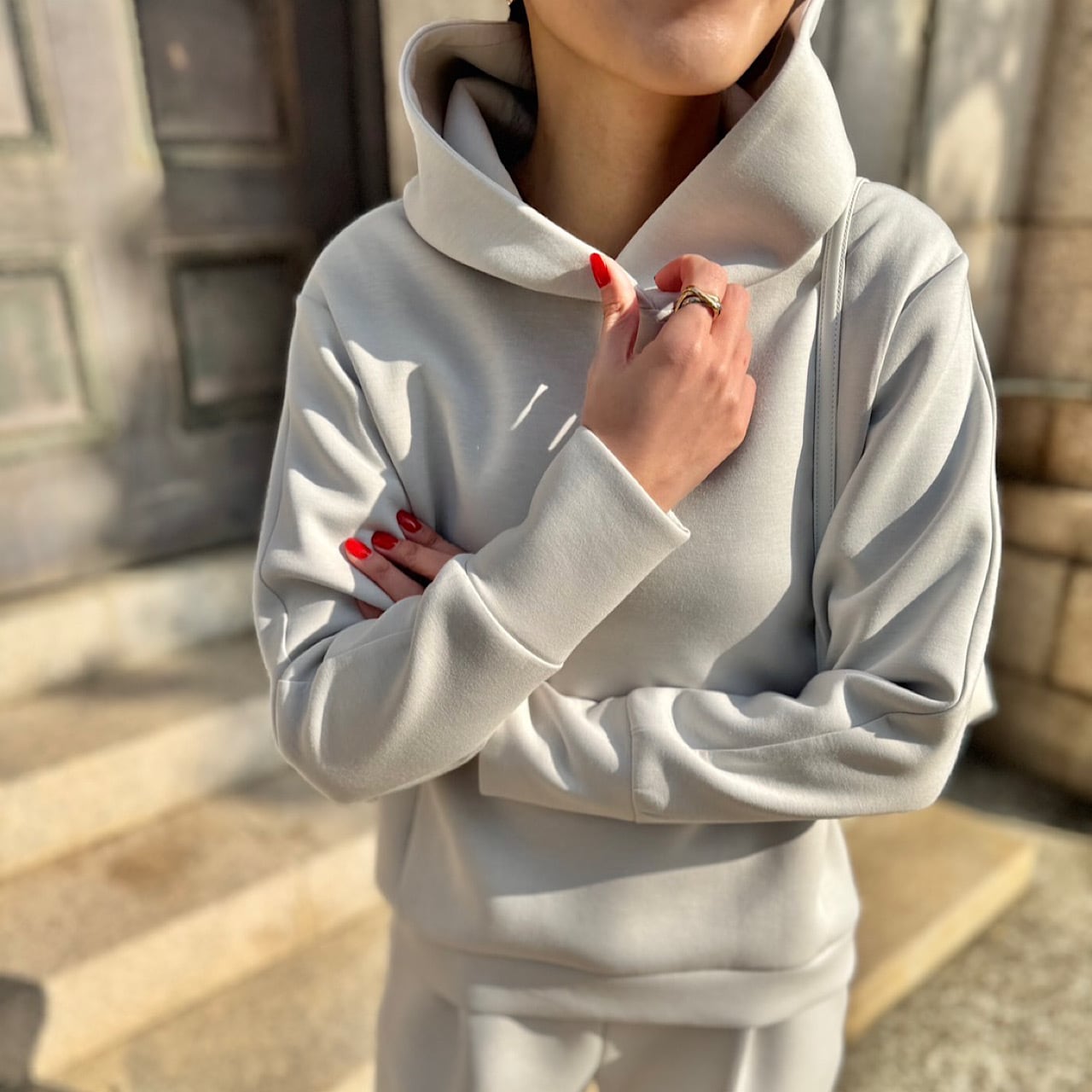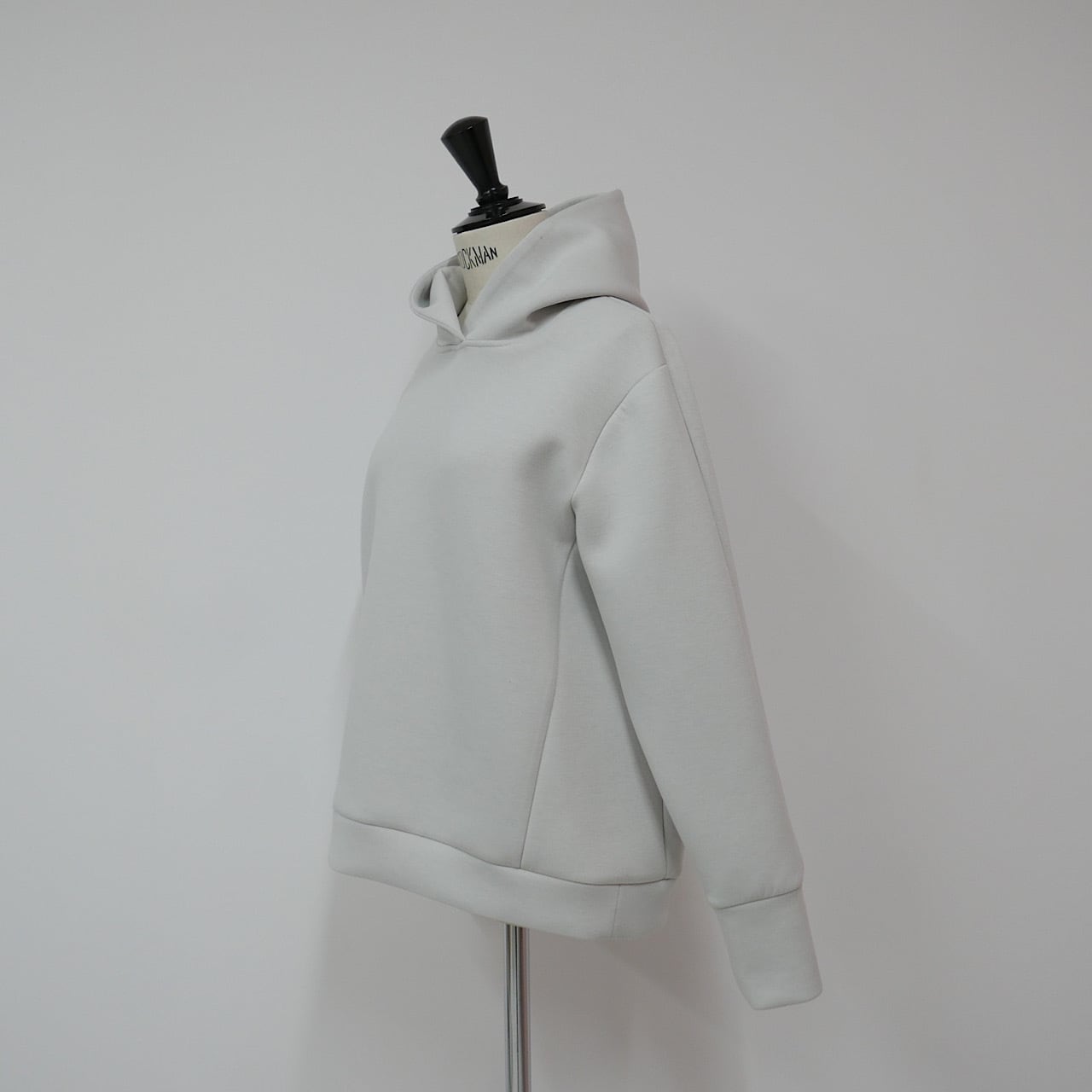 やわらかなボンディング素材を使用したフーディープルオーバー。