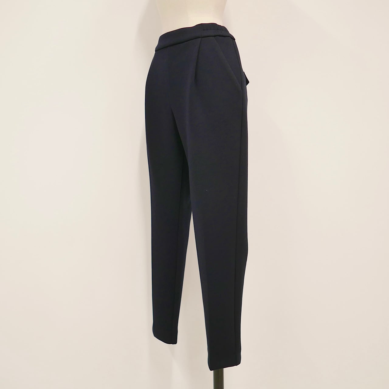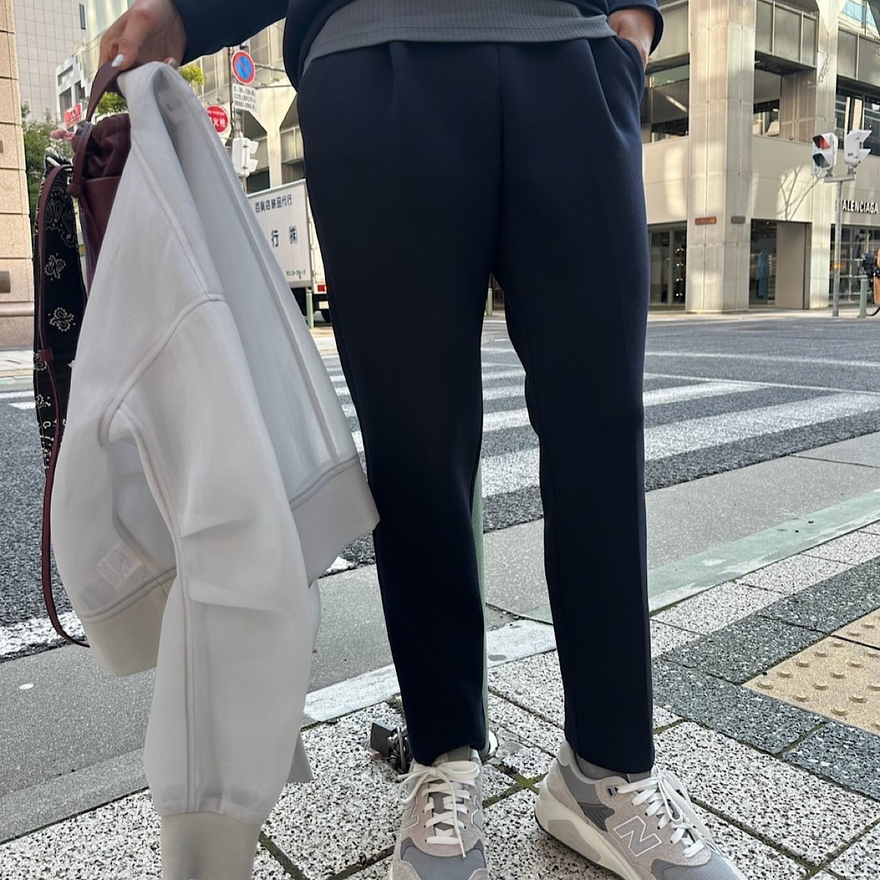 柔らかなボンディング素材を使用したテーパードパンツ。